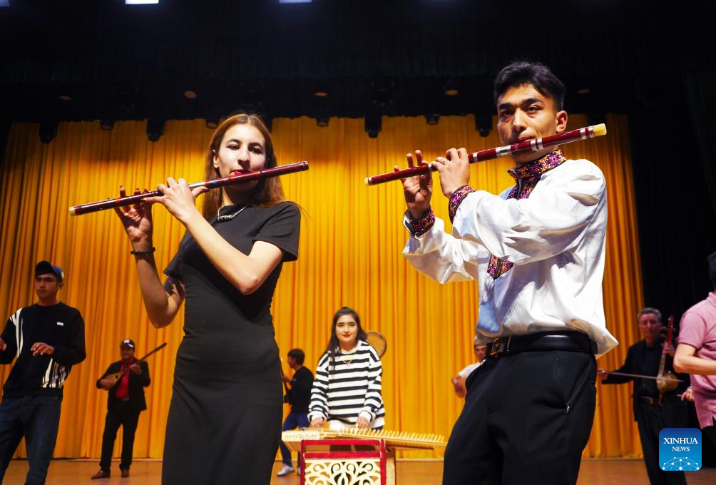 Artists of a local art troupe play the traditional instrument during a rehearsal in Taxkorgan Tajik Autonomous County, northwest China's Xinjiang Uygur Autonomous Region, Sept. 7, 2023. Taxkorgan Tajik Autonomous County has made great efforts in the integration of local culture and tourism in recent years, enriching the cultural life of people and promoting foreign exchanges. The county also carries forward traditional Chinese culture to build cultural tourism festivals, which shows the scenery of the Pamir Plateau and the happy and stable life of the people. (Xinhua/Hu Huhu)