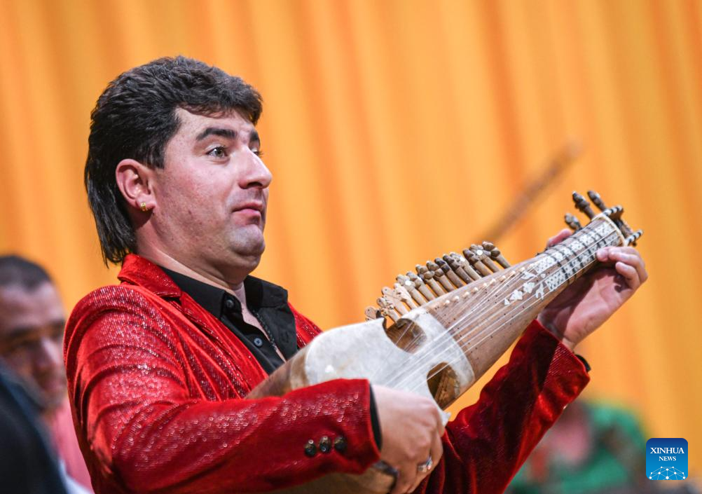 An artist of a local art troupe plays the traditional instrument during a rehearsal in Taxkorgan Tajik Autonomous County, northwest China's Xinjiang Uygur Autonomous Region, Sept. 7, 2023. Taxkorgan Tajik Autonomous County has made great efforts in the integration of local culture and tourism in recent years, enriching the cultural life of people and promoting foreign exchanges. The county also carries forward traditional Chinese culture to build cultural tourism festivals, which shows the scenery of the Pamir Plateau and the happy and stable life of the people. (Xinhua/Hu Huhu)