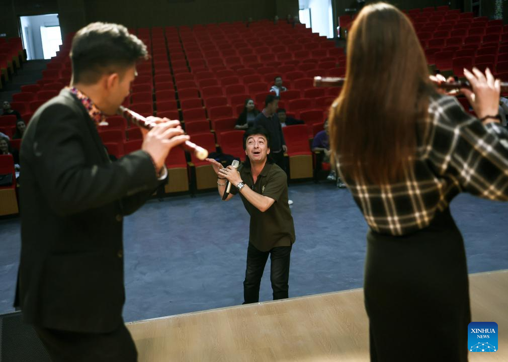 An artist directs a rehearsal in Taxkorgan Tajik Autonomous County, northwest China's Xinjiang Uygur Autonomous Region, Sept. 4, 2023. Taxkorgan Tajik Autonomous County has made great efforts in the integration of local culture and tourism in recent years, enriching the cultural life of people and promoting foreign exchanges. The county also carries forward traditional Chinese culture to build cultural tourism festivals, which shows the scenery of the Pamir Plateau and the happy and stable life of the people. (Xinhua/Lan Hongguang)