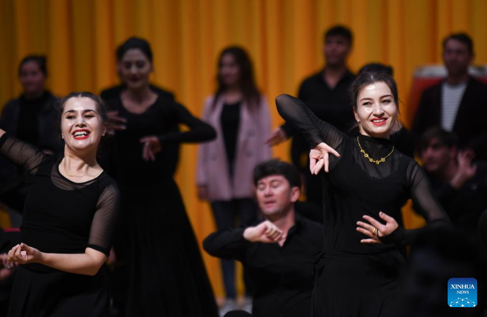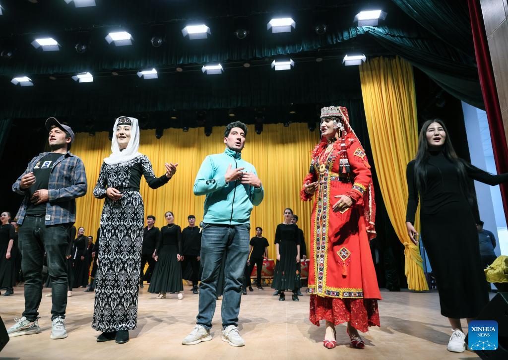 Artists of a local art troupe rehearse a program in Taxkorgan Tajik Autonomous County, northwest China's Xinjiang Uygur Autonomous Region, Sept. 4, 2023. Taxkorgan Tajik Autonomous County has made great efforts in the integration of local culture and tourism in recent years, enriching the cultural life of people and promoting foreign exchanges. The county also carries forward traditional Chinese culture to build cultural tourism festivals, which shows the scenery of the Pamir Plateau and the happy and stable life of the people. (Xinhua/Jin Haoyuan)