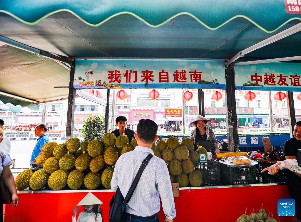 Vendors sell goods from Southeast Asian countries in Dongxing, south China's Guangxi Zhuang Autonomous Region, May 18, 2023.