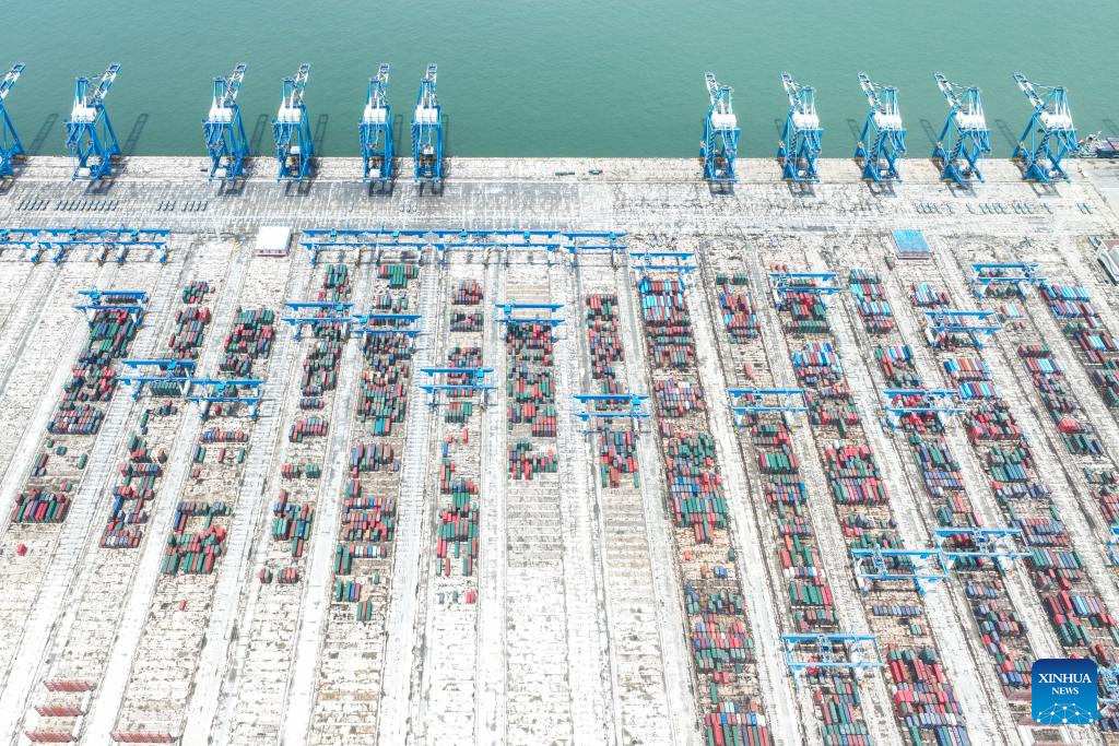 This aerial photo taken on July 22, 2023 shows an automated container wharf of the Beibu Gulf Port in Qinzhou, south China's Guangxi Zhuang Autonomous Region.