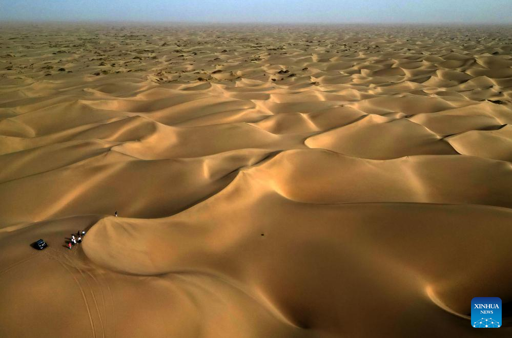 A car drives in a desert scenic spot in Makit County of Kashgar, northwest China's Xinjiang Uygur Autonomous Region, Sept. 7, 2023. Makit County, located on the southwestern rim of the Taklimakan Desert, has taken advantage of its natural resources to develop tourism and provide jobs for the local people. (Xinhua/Li An)