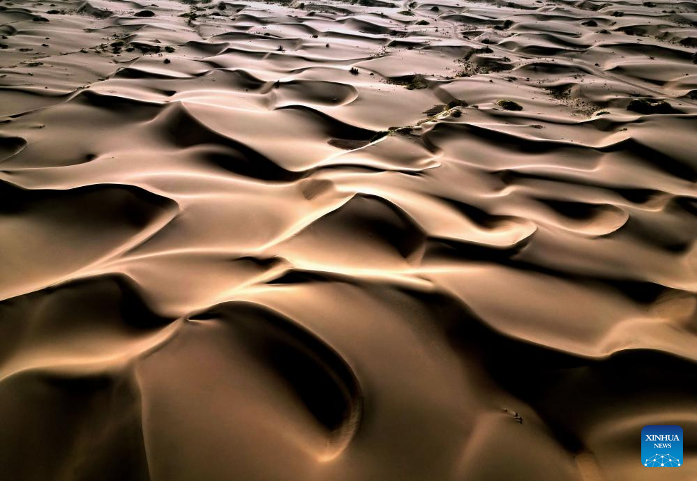 This aerial photo taken on Sept. 7, 2023 shows the scenery of a desert scenic spot in Makit County of Kashgar, northwest China's Xinjiang Uygur Autonomous Region. Makit County, located on the southwestern rim of the Taklimakan Desert, has taken advantage of its natural resources to develop tourism and provide jobs for the local people. (Xinhua/Li An)