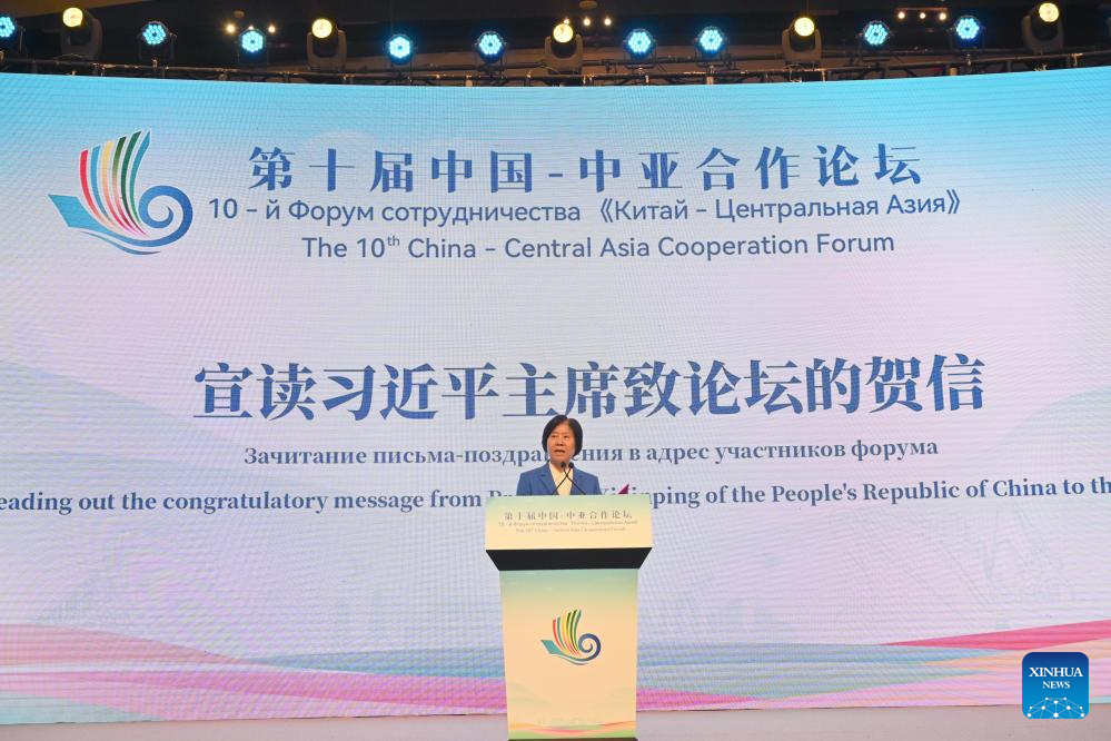 Shen Yueyue, vice chairperson of the National Committee of the Chinese People's Political Consultative Conference, also chairperson of Good-Neighborliness, Friendship and Cooperation Commission of the Shanghai Cooperation Organization, reads out President Xi Jinping's congratulatory message to the 10th China-Central Asia Cooperation Forum before delivering a keynote speech in Xiamen, southeast China's Fujian Province, Sept. 9, 2023. The forum opened here on Saturday. (Xinhua/Jiang Kehong)