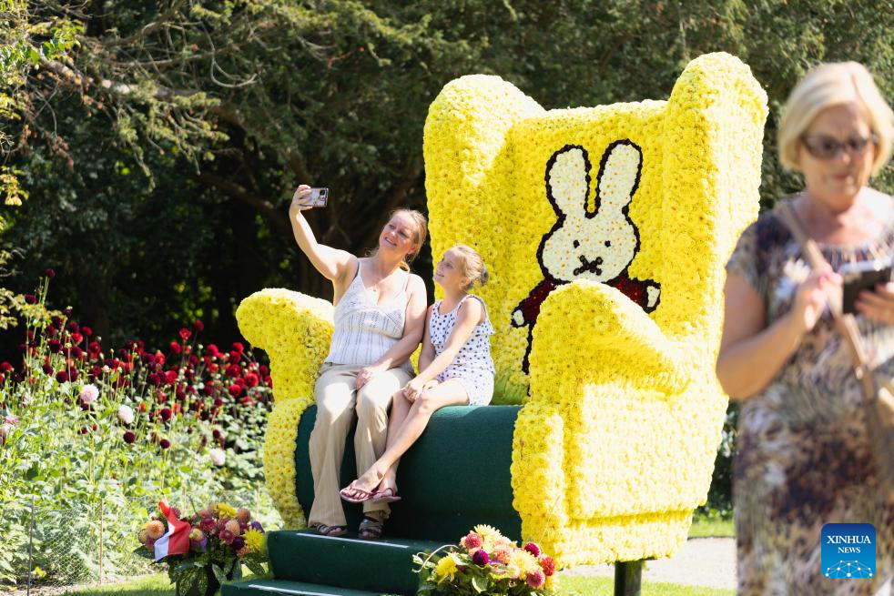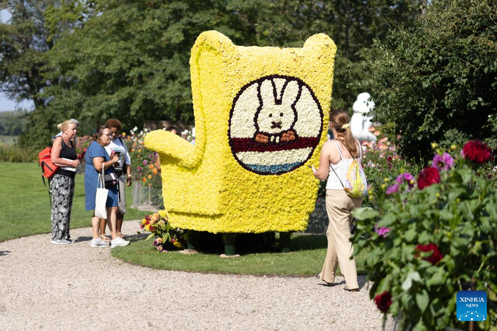 People enjoy a chair of dahlias at the garden of Keukenhof Castle in Lisse, the Netherlands, Sept. 9, 2023. The Holland Dahlia Event 2023 is held from Sept. 8 to 10. (Photo by Sylvia Lederer/Xinhua)