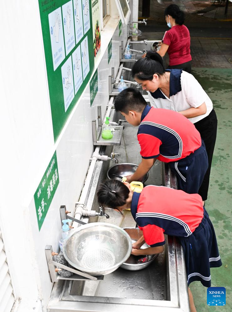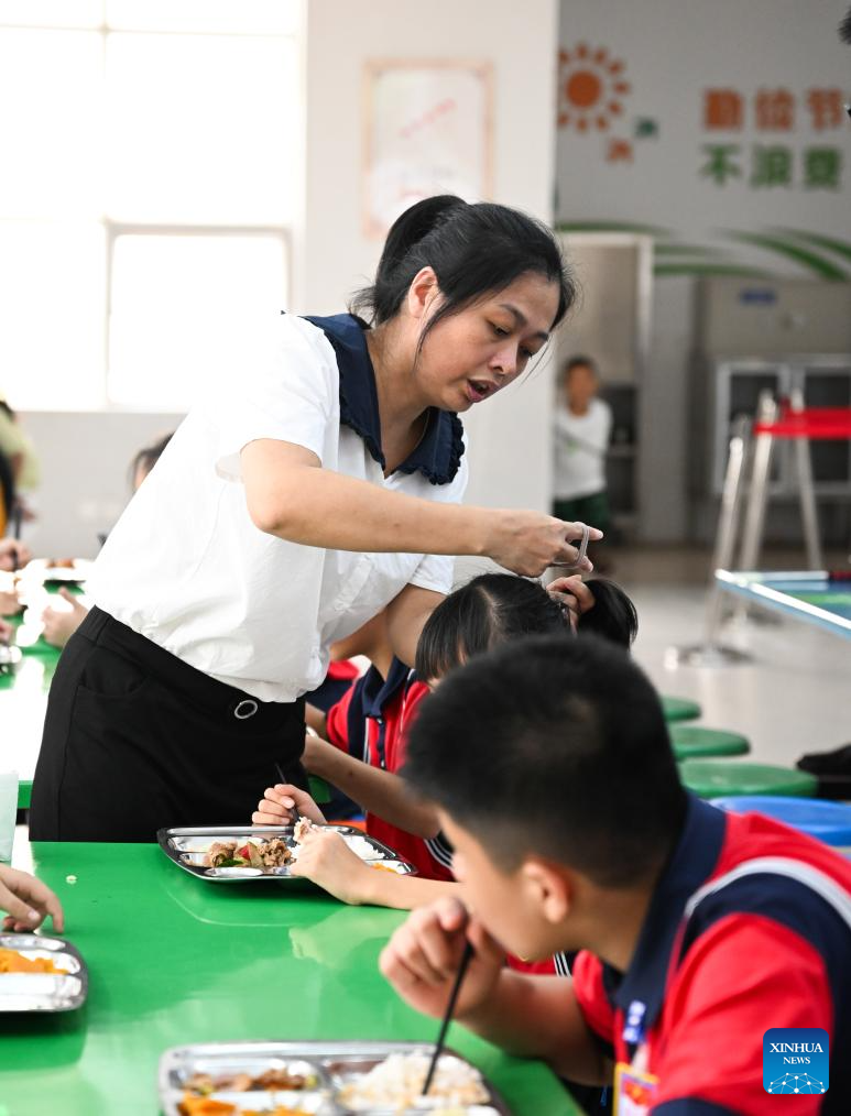 Fu Yaohui (back) instructs as students clean their tableware after a meal at Hainan (Haikou) Special School in Haikou, south China's Hainan Province, Sept. 6, 2023. (Xinhua/Yang Guanyu)