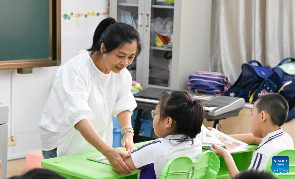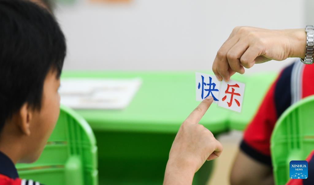 Fu Yaohui teaches a student to read at Hainan (Haikou) Special School in Haikou, south China's Hainan Province, Sept. 6, 2023. (Xinhua/Yang Guanyu)