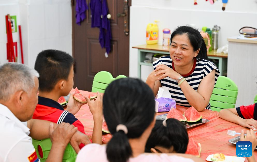 Fu Yaohui (R) talks with students and their families at Hainan (Haikou) Special School in Haikou, south China's Hainan Province, Sept. 8, 2023. (Xinhua/Yang Guanyu)