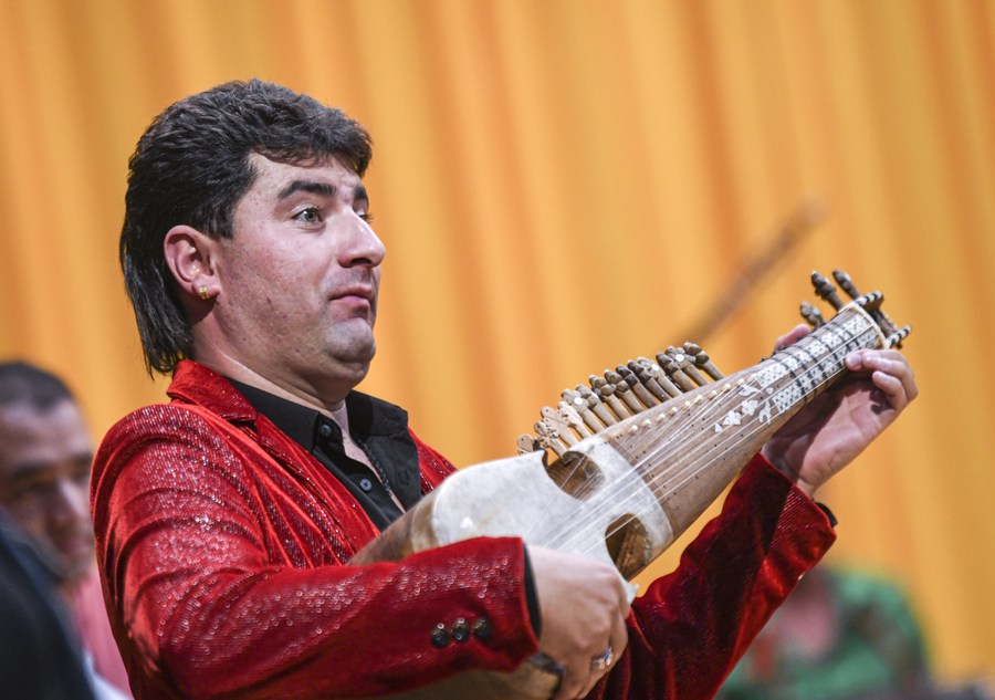 An artist of a local art troupe plays the traditional instrument during a rehearsal in Taxkorgan Tajik Autonomous County, northwest China's Xinjiang Uygur Autonomous Region, Sept. 4, 2023. (Xinhua/Cheng Tingting)