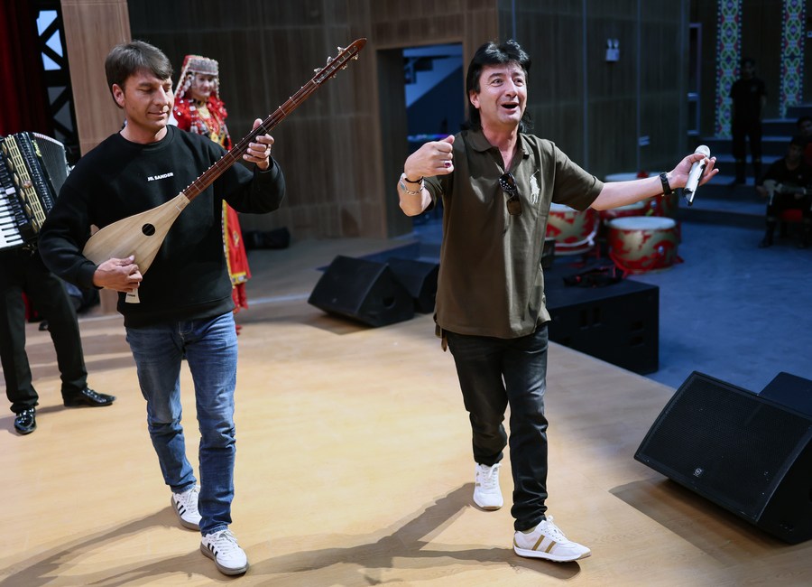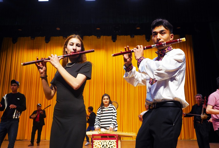Artists of a local art troupe rehearse a program for a music festival in Taxkorgan Tajik Autonomous County, northwest China's Xinjiang Uygur Autonomous Region, Sept. 4, 2023. (Xinhua/Lan Hongguang)