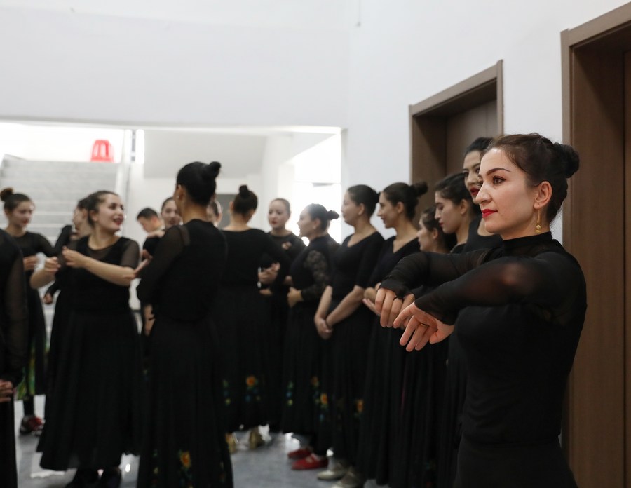 Artists of a local art troupe rehearse a dance in Taxkorgan Tajik Autonomous County, northwest China's Xinjiang Uygur Autonomous Region, Sept. 4, 2023. (Xinhua/Wang Fei)