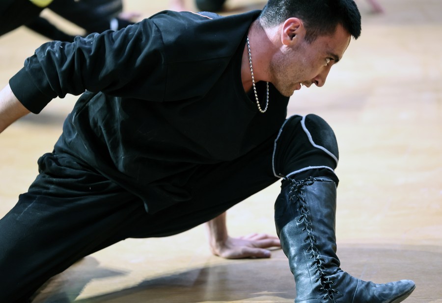 An artist of a local art troupe rehearses an acrobatic show in Taxkorgan Tajik Autonomous County, northwest China's Xinjiang Uygur Autonomous Region, Sept. 4, 2023. (Xinhua/Lan Hongguang)