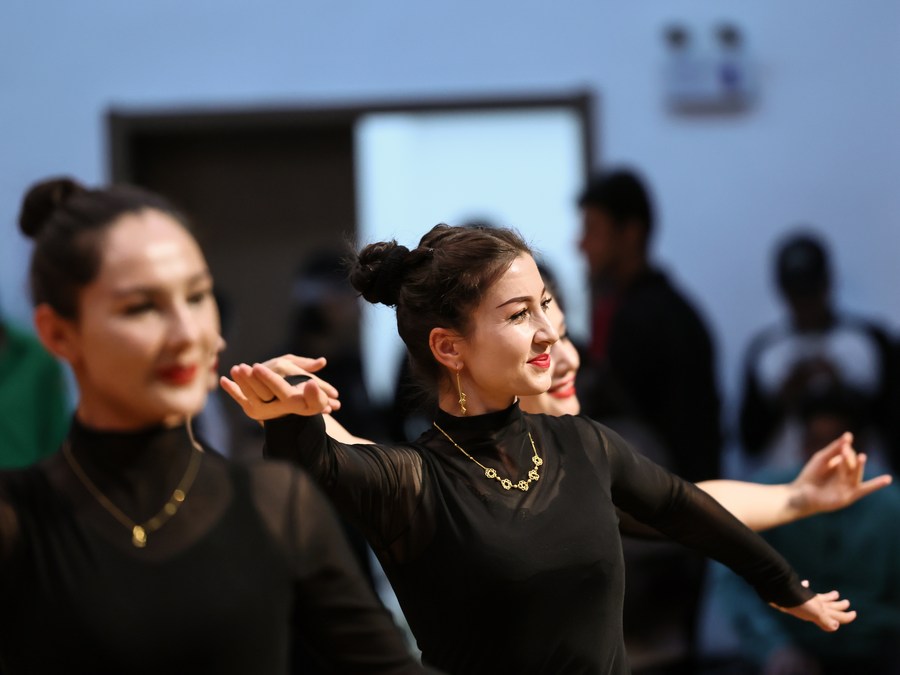 Artists of a local art troupe rehearse a dance in Taxkorgan Tajik Autonomous County, northwest China's Xinjiang Uygur Autonomous Region, Sept. 4, 2023. (Xinhua/Cheng Tingting)