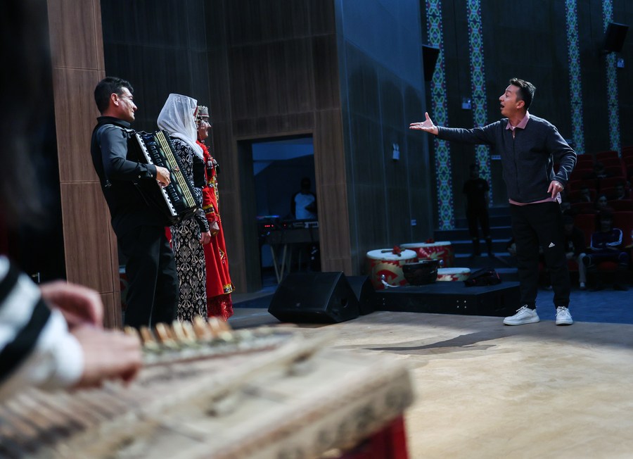 An artist directs a rehearsal in Taxkorgan Tajik Autonomous County, northwest China's Xinjiang Uygur Autonomous Region, Sept. 4, 2023. (Xinhua/Lan Hongguang)
