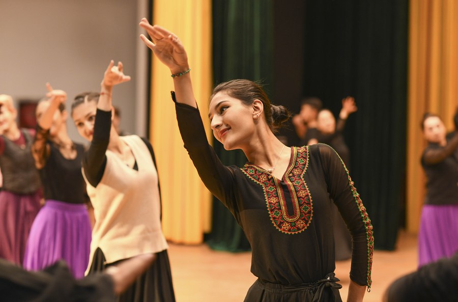 Artists of a local art troupe rehearse a dance in Taxkorgan Tajik Autonomous County, northwest China's Xinjiang Uygur Autonomous Region, Sept. 7, 2023. (Xinhua/Hu Huhu)