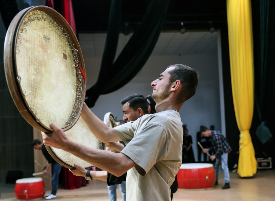 Artists of a local art troupe play the hand drums during a rehearsal in Taxkorgan Tajik Autonomous County, northwest China's Xinjiang Uygur Autonomous Region, Sept. 4, 2023. (Xinhua/Hu Huhu)