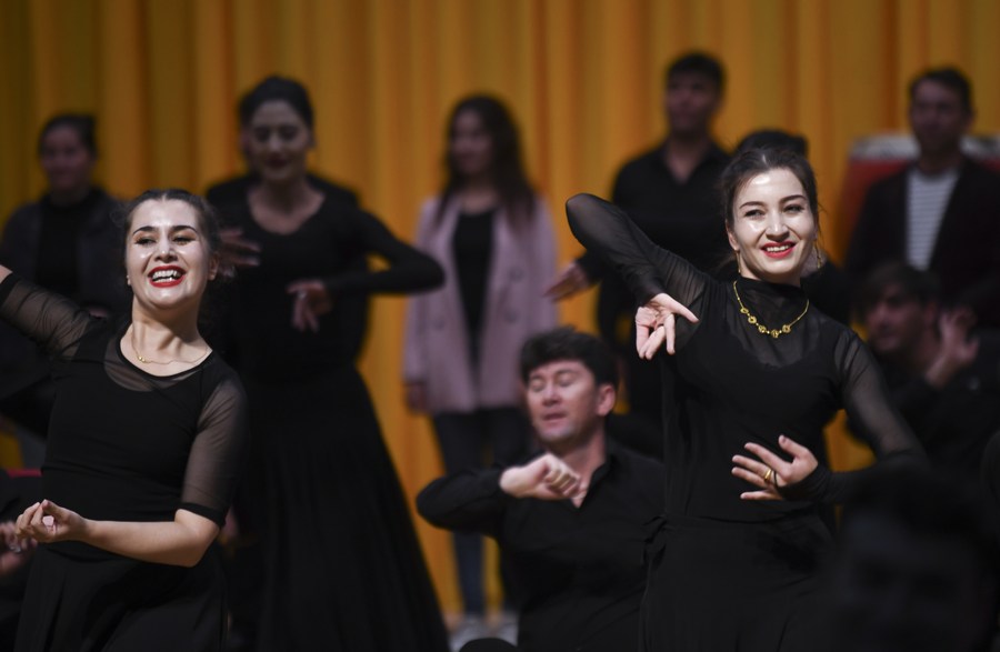Artists of a local art troupe rehearse a program in Taxkorgan Tajik Autonomous County, northwest China's Xinjiang Uygur Autonomous Region, Sept. 4, 2023. (Xinhua/Jin Haoyuan)