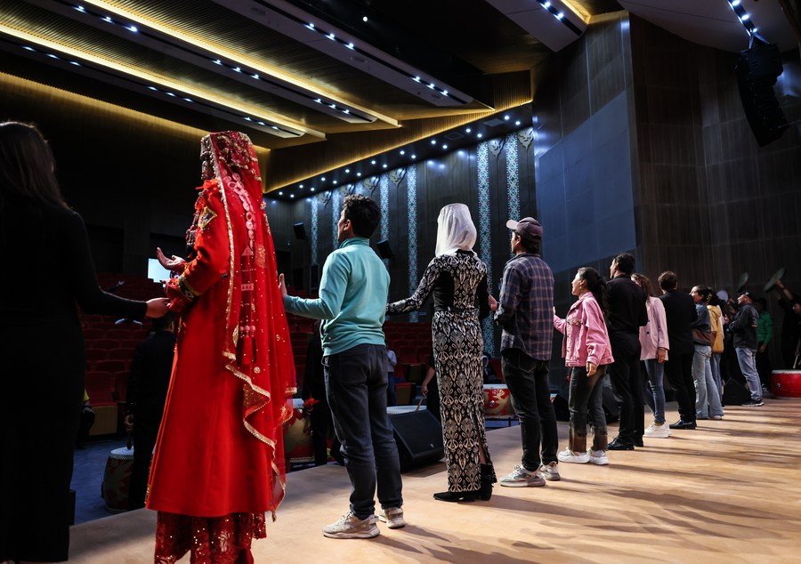 Artists of a local art troupe rehearse a program in Taxkorgan Tajik Autonomous County, northwest China's Xinjiang Uygur Autonomous Region, Sept. 7, 2023. (Xinhua/Hu Huhu)