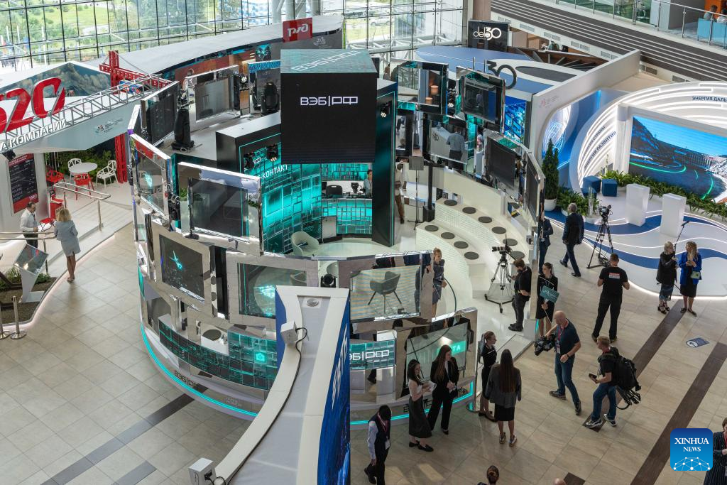 People visit exhibition hall of the 8th Eastern Economic Forum in Vladivostok, Russia, Sept. 10, 2023. The Russian Far East city of Vladivostok welcomed thousands of participants for the 8th Eastern Economic Forum (EEF) on Sunday to promote economic and cultural exchanges among the regions of the Asia-Pacific. The four-day event is organized by the Roscongress Foundation. (Photo by Guo Feizhou/Xinhua)