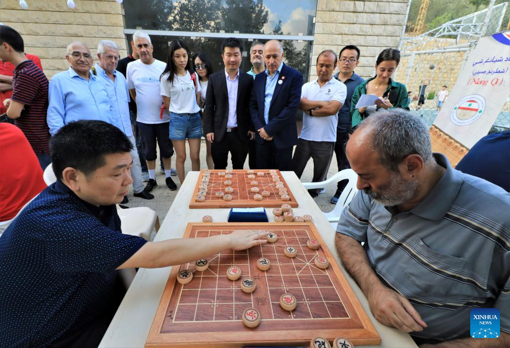 Participants compete during the Lebanese-Chinese XiangQi Friendship Championship in Deir el Qamar, Mount Lebanon Governorate, Lebanon, on Sept. 10, 2023. A competition for Chinese chess, called XiangQi, organized by the XiangQi Committee in Lebanon, was held on Sunday in Deir el Qamar, a historic town in southern-central Lebanon, attracting about 70 Lebanese and Chinese fans of all ages. (Xinhua/Liu Zongya)
