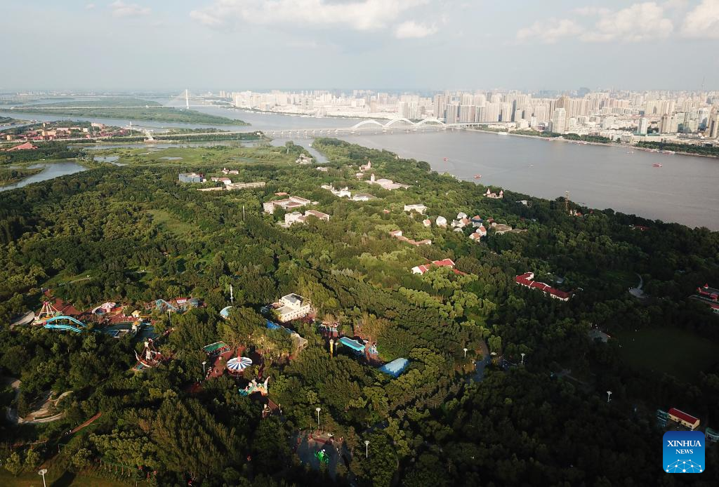 This aerial photo taken on July 31, 2023 shows a view of Sun Island scenic spot in Harbin, northeast China's Heilongjiang Province. Situated on the northern bank of the Songhua River in Harbin City, Sun Island scenic spot offers a multifunctional landscape that combines European-style architecture, rural scenery, folk culture, and ice and snow culture. (Xinhua/Wang Jianwei)