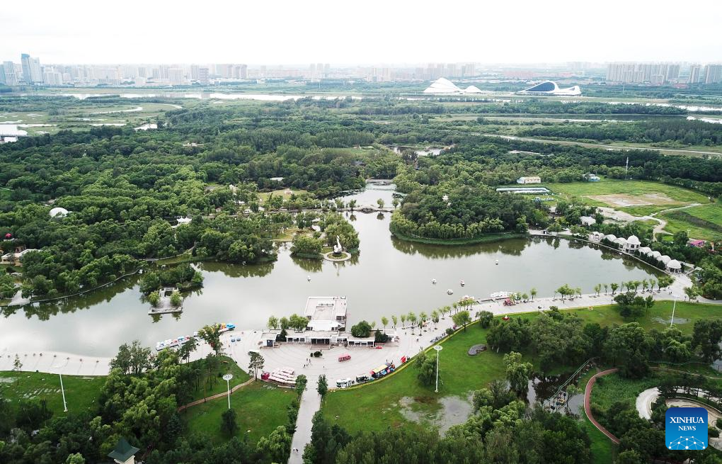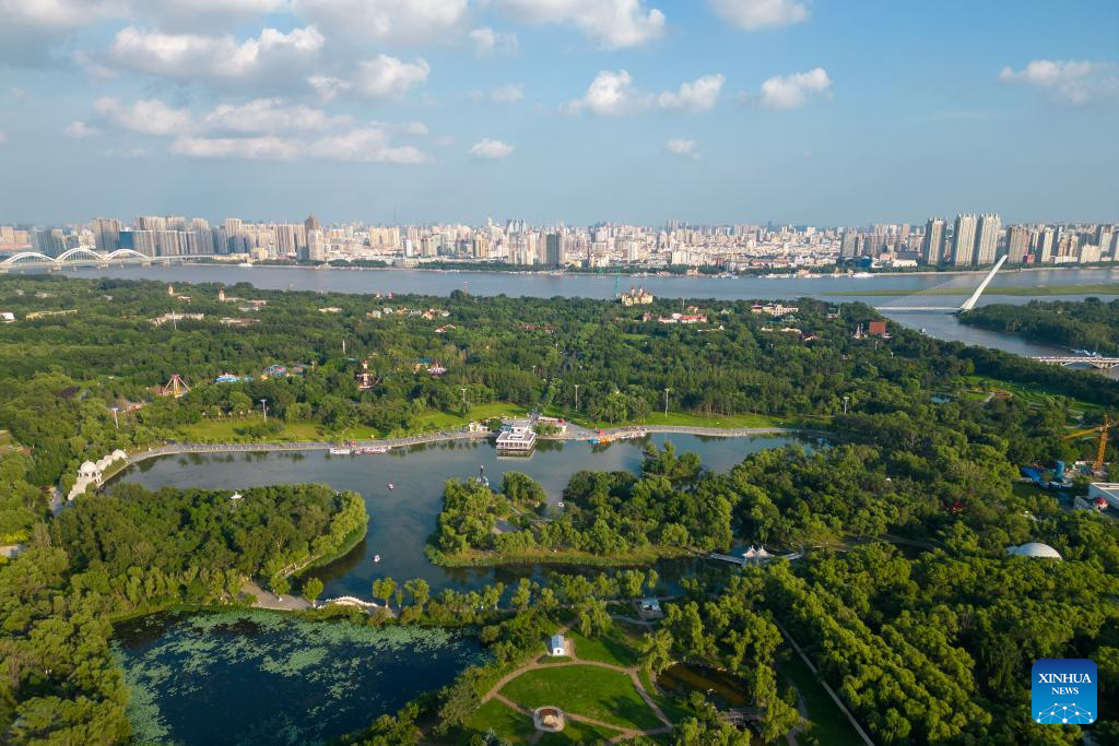 This aerial photo taken on July 31, 2023 shows a view of Sun Island scenic spot in Harbin, northeast China's Heilongjiang Province. Situated on the northern bank of the Songhua River in Harbin City, Sun Island scenic spot offers a multifunctional landscape that combines European-style architecture, rural scenery, folk culture, and ice and snow culture. (Xinhua/Zhang Tao)