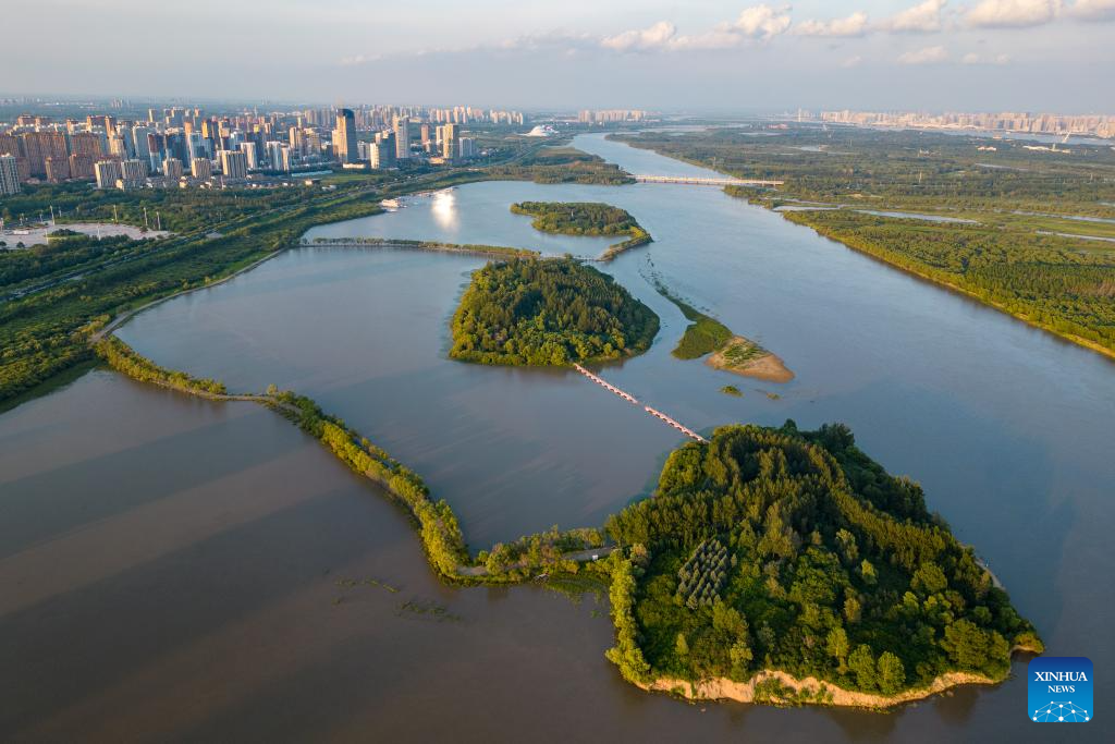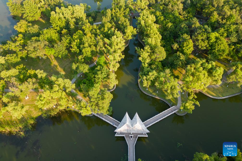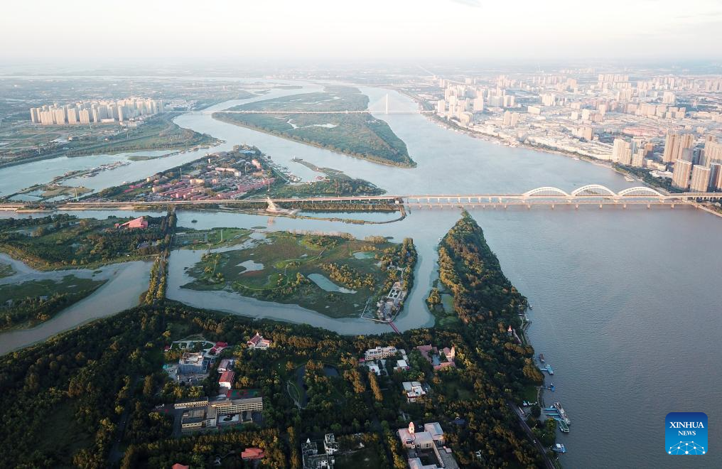 This aerial photo taken on Sept. 11, 2023 shows a view of Sun Island scenic spot in Harbin, northeast China's Heilongjiang Province. Situated on the northern bank of the Songhua River in Harbin City, Sun Island scenic spot offers a multifunctional landscape that combines European-style architecture, rural scenery, folk culture, and ice and snow culture. (Xinhua/Wang Jianwei)