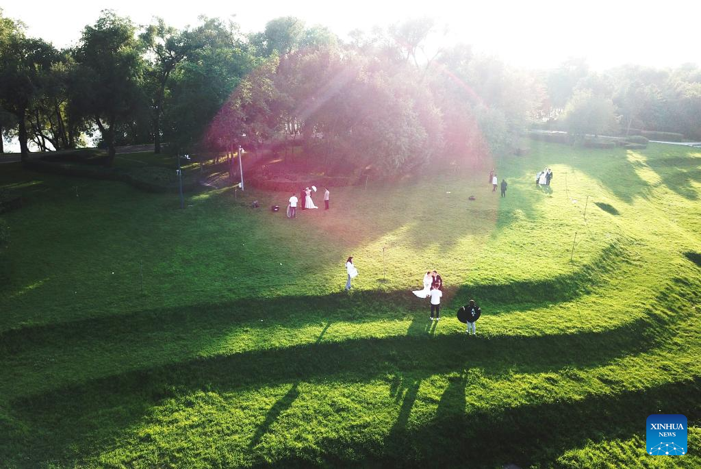 This aerial photo taken on July 31, 2023 shows couples posing for wedding photos at Sun Island scenic spot in Harbin, northeast China's Heilongjiang Province. Situated on the northern bank of the Songhua River in Harbin City, Sun Island scenic spot offers a multifunctional landscape that combines European-style architecture, rural scenery, folk culture, and ice and snow culture. (Xinhua/Wang Jianwei)