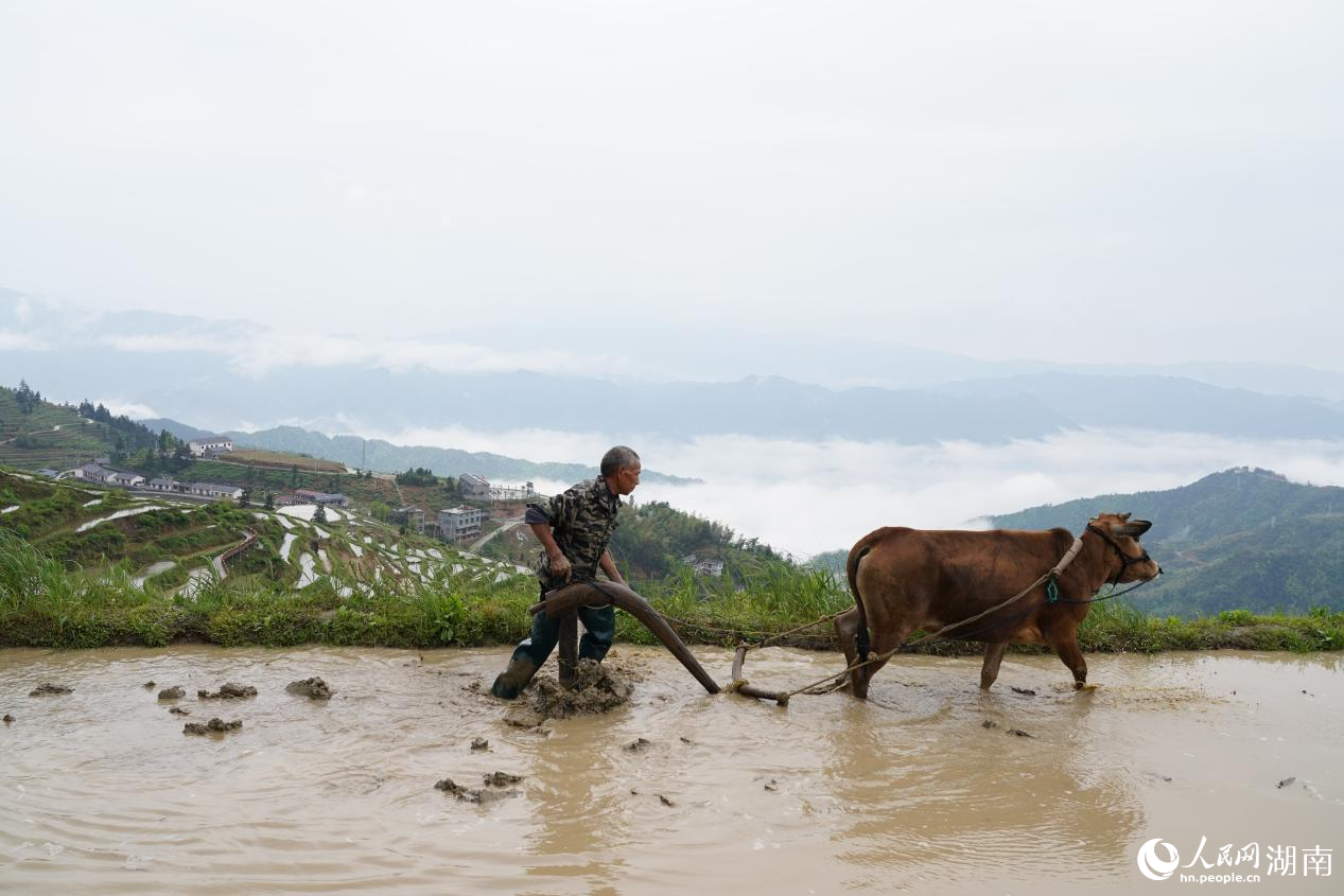 A farmer plows a terraced field in Shanbei village, Xupu county, central China's Hunan Province. (People's Daily Online/Xiang Yu)