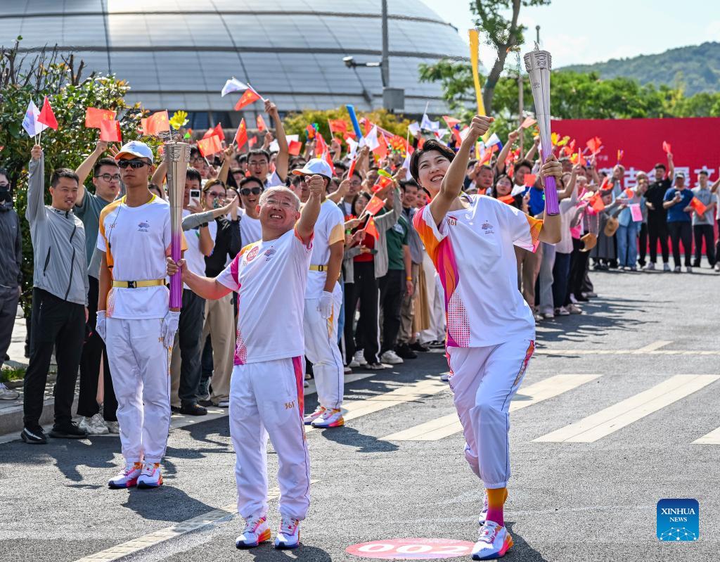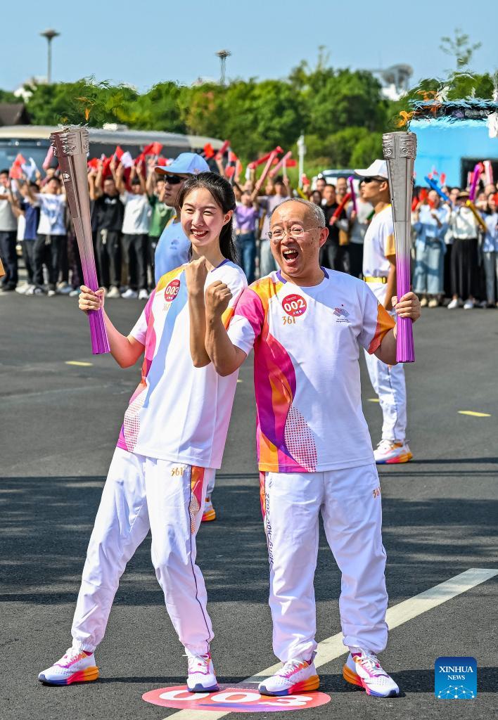 Torch bearers Yuan Xinyue (R) and Qian Haijun pose during the torch relay of the 19th Asian Games in Ningbo, east China's Zhejiang Province, Sept. 12, 2023. (Xinhua/Sun Fei)
