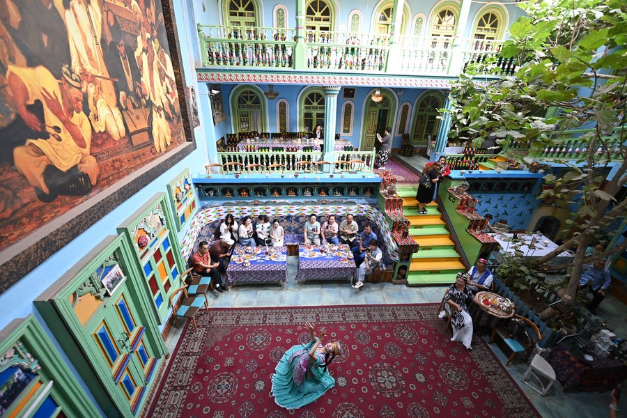 A performer dances to the music at Salametgul Khari's homestay in the old town of Kashgar City, northwest China's Xinjiang Uygur Autonomous Region, Sept. 6, 2023. (Xinhua/Li Xiang)