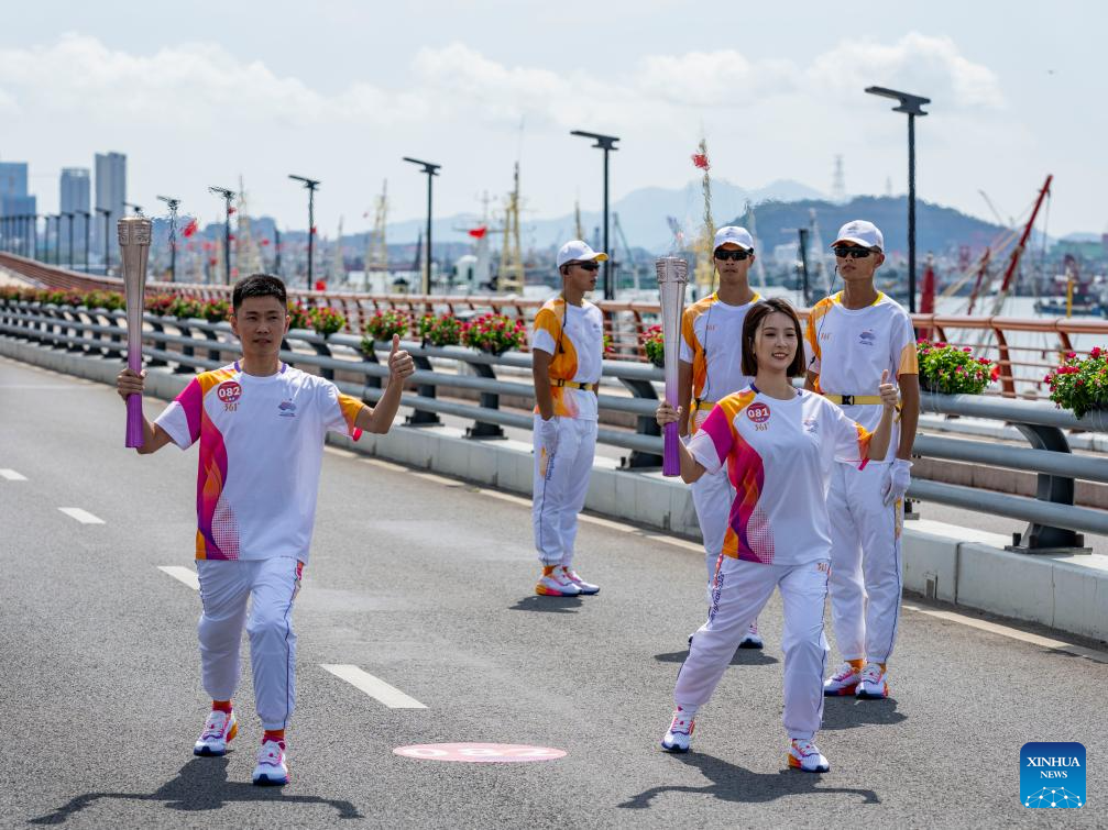 Torch bearer Luo Yu runs with the torch during the torch relay of the 19th Asian Games in Zhoushan, east China's Zhejiang Province, Sept. 13, 2023. (Xinhua/Huang Zongzhi)