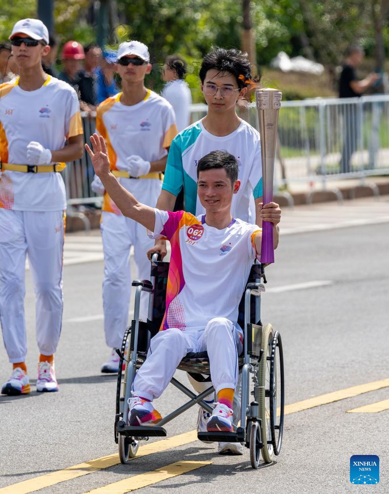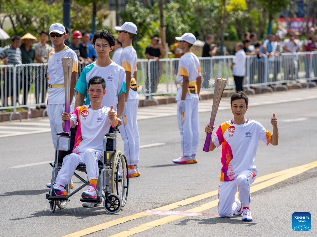 Torch bearer Yang Zehui runs with the torch during the torch relay of the 19th Asian Games in Zhoushan, east China's Zhejiang Province, Sept. 13, 2023. (Xinhua/Huang Zongzhi)