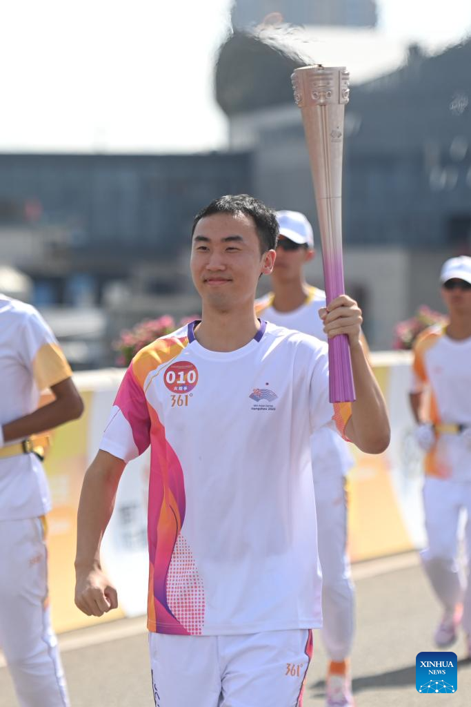 Torch bearer Zhang Haibin holds the torch during the torch relay of the 19th Asian Games in Zhoushan, east China's Zhejiang Province, Sept. 13, 2023. (Xinhua/Sun Fei)