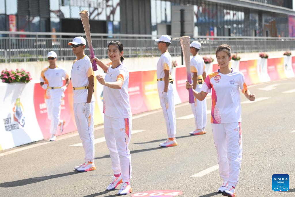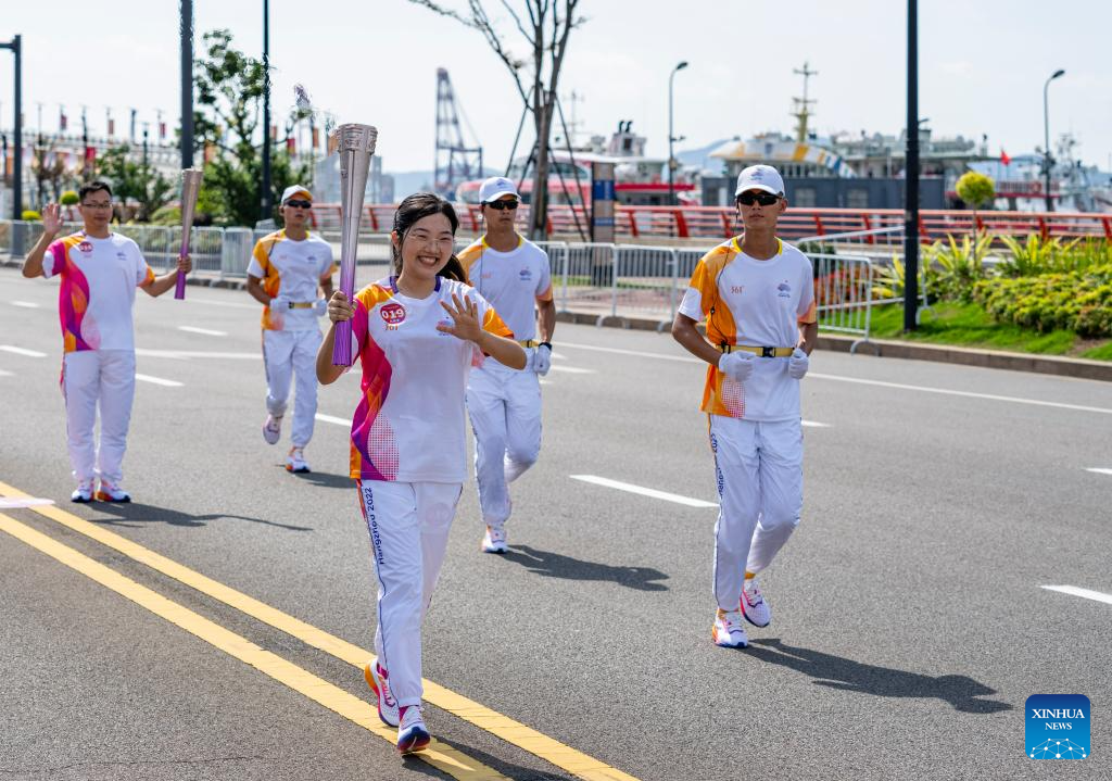 Torch bearer Lin Jing runs with the torch during the torch relay of the 19th Asian Games in Zhoushan, east China's Zhejiang Province, Sept. 13, 2023. (Xinhua/Sun Fei)