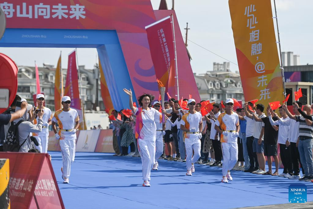 People watch the torch relay of the 19th Asian Games in Zhoushan, east China's Zhejiang Province, Sept. 13, 2023. (Xinhua/Huang Zongzhi)