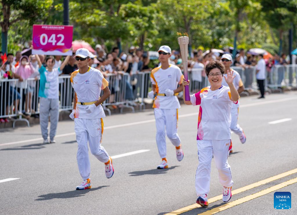 Torch bearer Fan Qun runs with the torch during the torch relay of the 19th Asian Games in Zhoushan, east China's Zhejiang Province, Sept. 13, 2023. (Xinhua/Sun Fei)