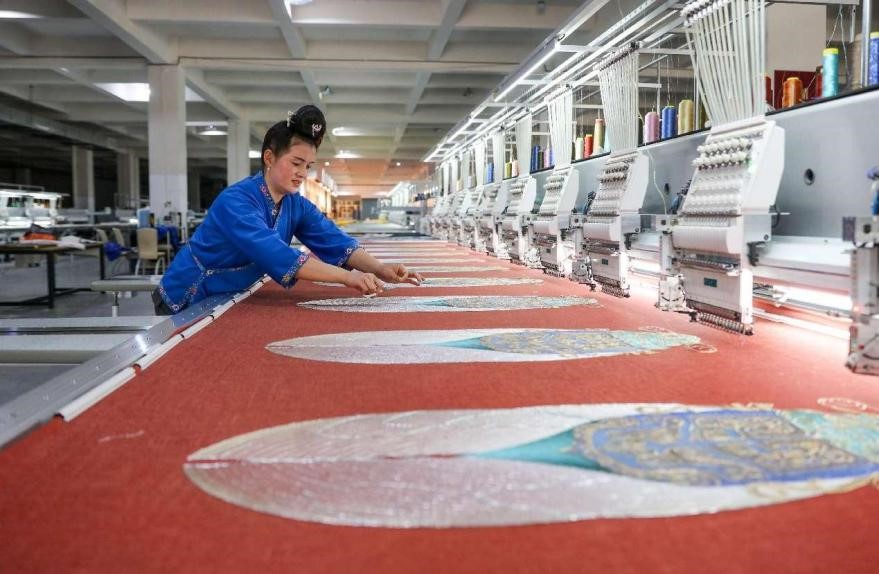 An embroiderer works in a smart workshop. (People's Daily Online/Mo Guibin)
