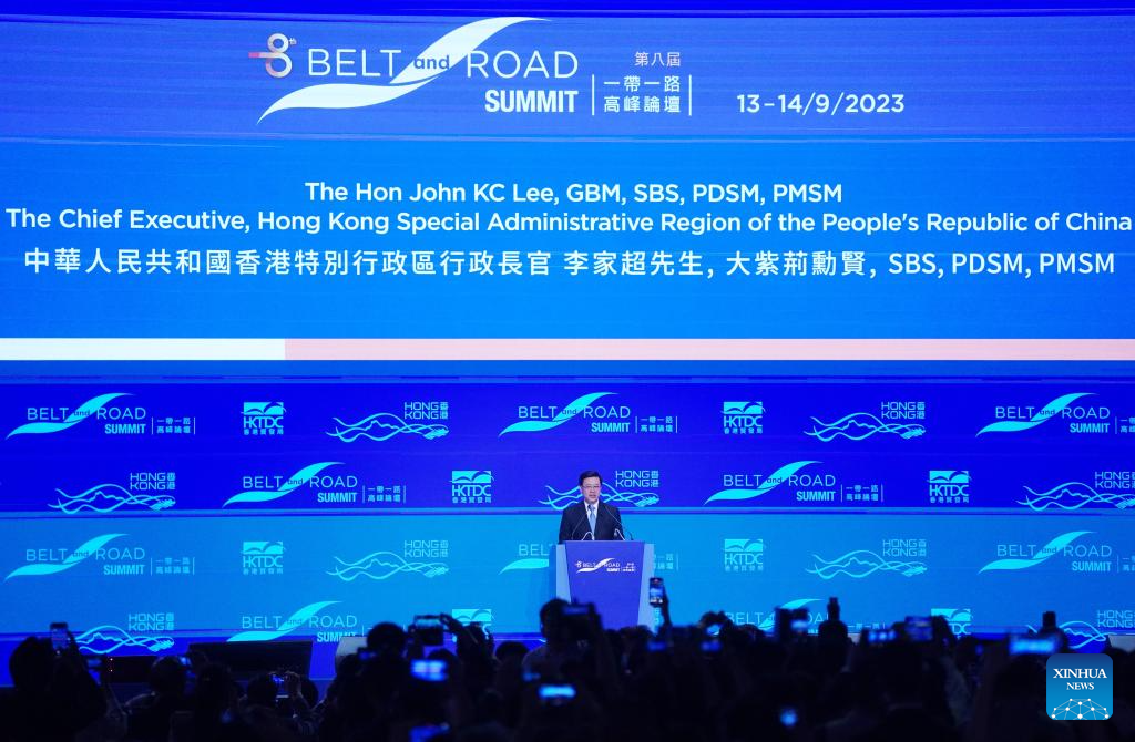 John Lee, chief executive of the Hong Kong Special Administrative Region (HKSAR), delivers a speech at the 8th Belt and Road Summit in south China's Hong Kong, Sept. 13, 2023. TO GO WITH "Roundup: Hong Kong injects new vitality into BRI" (Xinhua/Wang Shen)