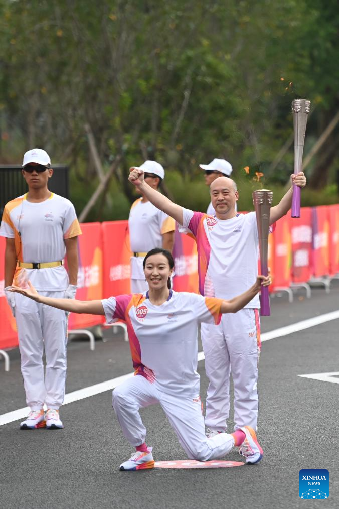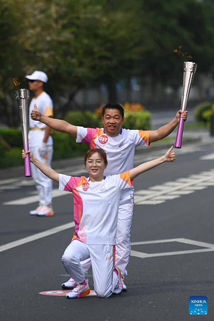 Torch bearers Feng Yu (Bottom) and Huang Junmin pose during the torch relay of the 19th Asian Games in Taizhou, east China's Zhejiang Province, Sept. 14, 2023. (Xinhua/Huang Zongzhi)