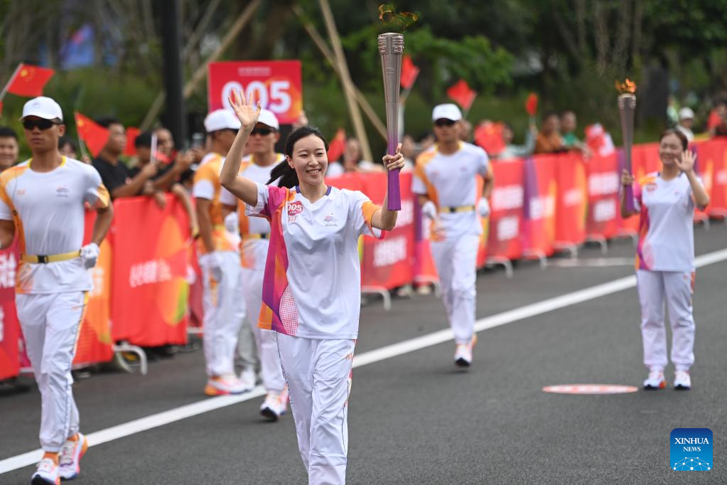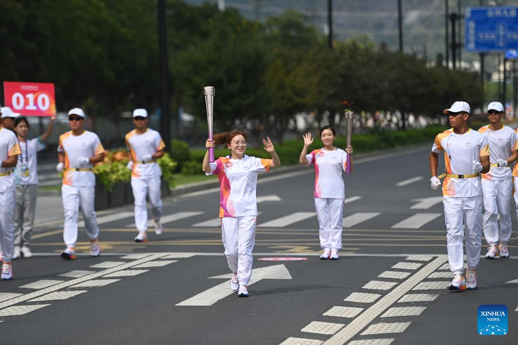 Torch bearer Yang Wenjie runs with the torch during the torch relay of the 19th Asian Games in Taizhou, east China's Zhejiang Province, Sept. 14, 2023. (Xinhua/Huang Zongzhi)