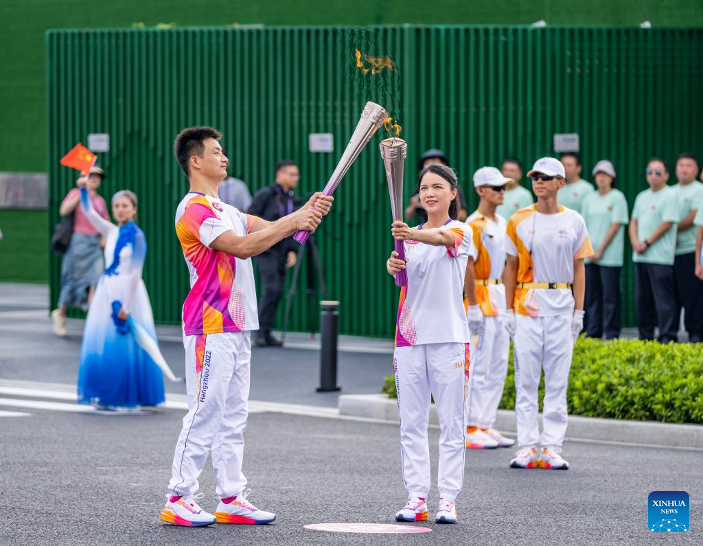 Torch bearers Wei Mengxi (R) and Lv Yicong pass the flame during the torch relay of the 19th Asian Games in Taizhou, east China's Zhejiang Province, Sept. 14, 2023. (Xinhua/Huang Zongzhi)