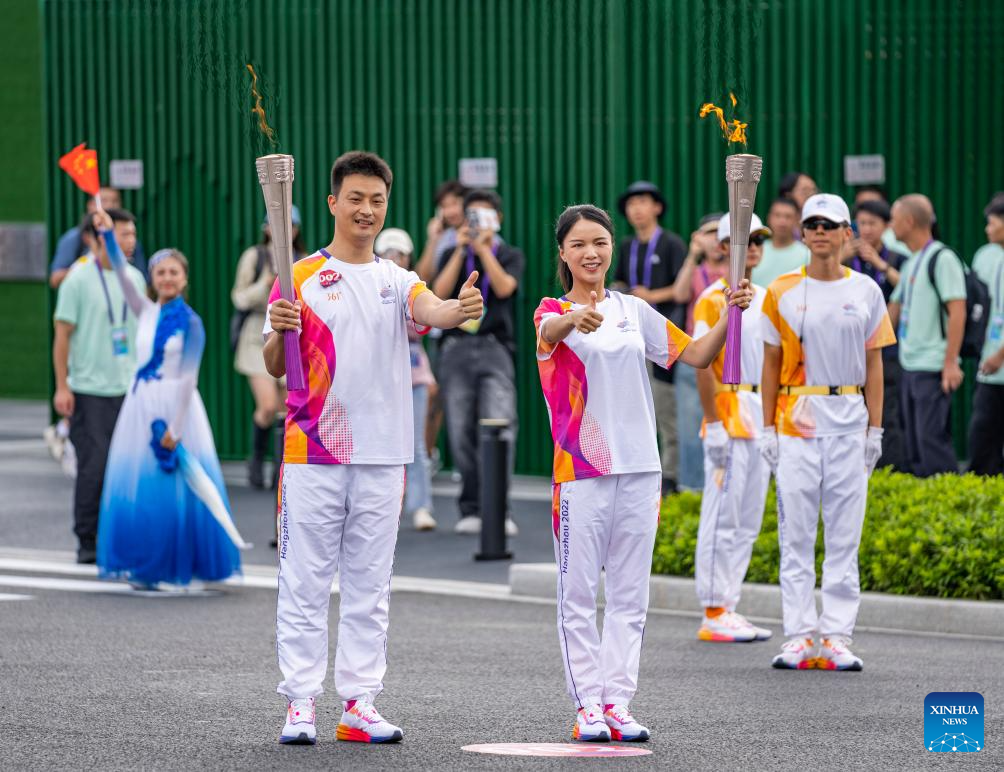 Torch bearers Ruan Lingfei (R) and Feng Yu pose during the torch relay of the 19th Asian Games in Taizhou, east China's Zhejiang Province, Sept. 14, 2023. (Xinhua/Huang Zongzhi)