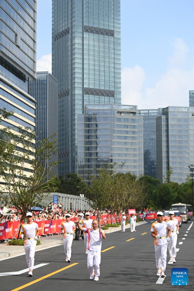 Torch bearer Ye Rongren runs with the torch during the torch relay of the 19th Asian Games in Taizhou, east China's Zhejiang Province, Sept. 14, 2023. (Xinhua/Huang Zongzhi)