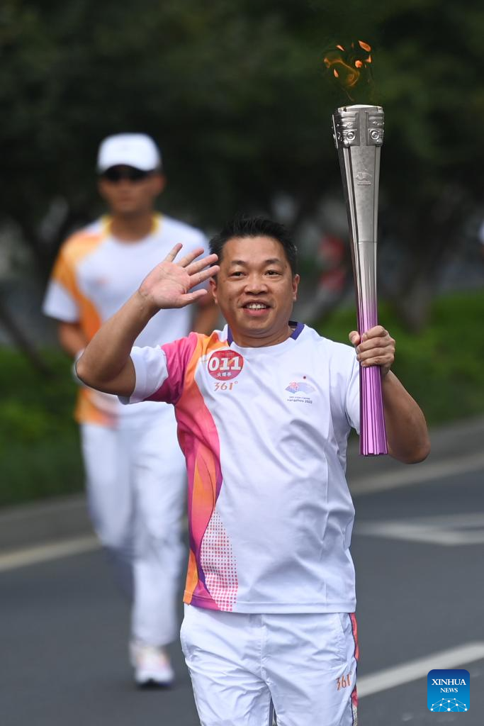 Torch bearer Lu Jingliang runs with the torch during the torch relay of the 19th Asian Games in Taizhou, east China's Zhejiang Province, Sept. 14, 2023. (Xinhua/Huang Zongzhi)