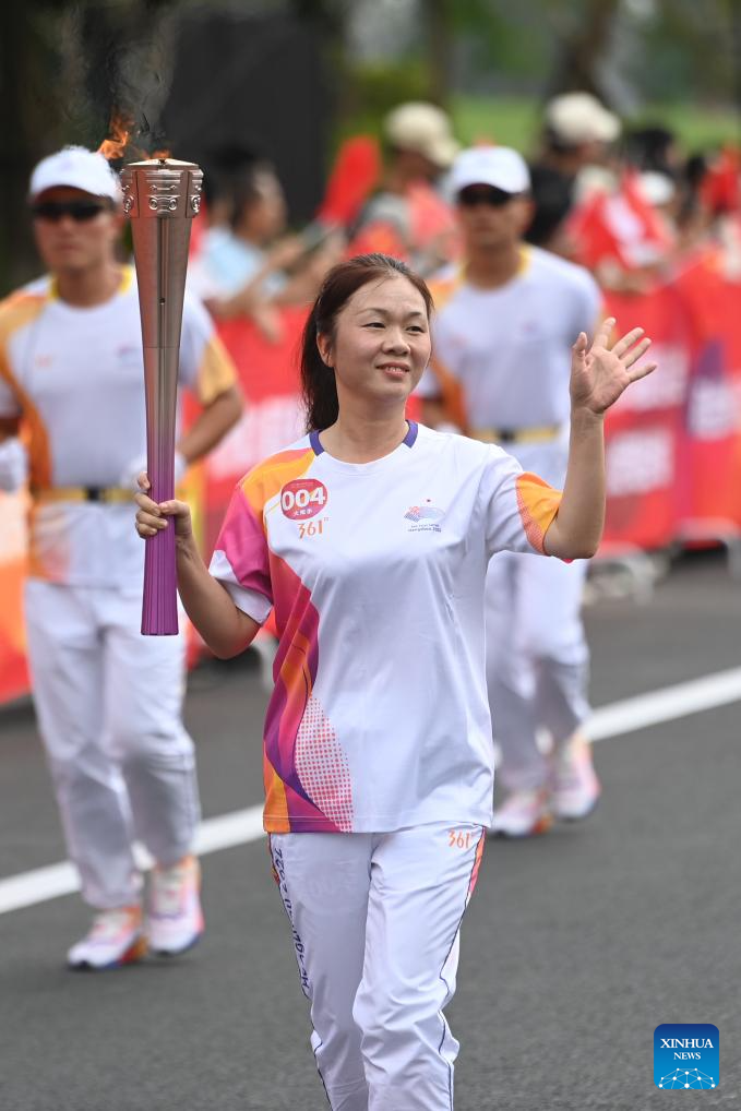Torch bearer Wei Mengxi holds the torch during during the torch relay of the 19th Asian Games in Taizhou, east China's Zhejiang Province, Sept. 14, 2023. (Xinhua/Sun Fei)