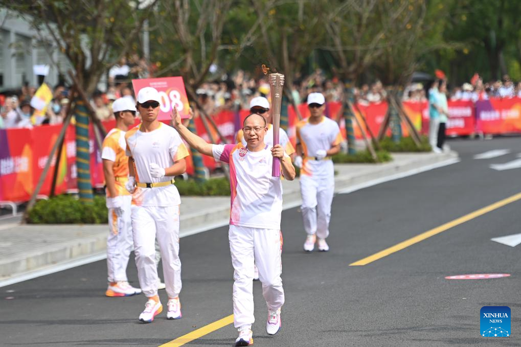 Torch bearer Guo Wenbiao runs with the torch during during the torch relay of the 19th Asian Games in Taizhou, east China's Zhejiang Province, Sept. 14, 2023. (Xinhua/Sun Fei)
