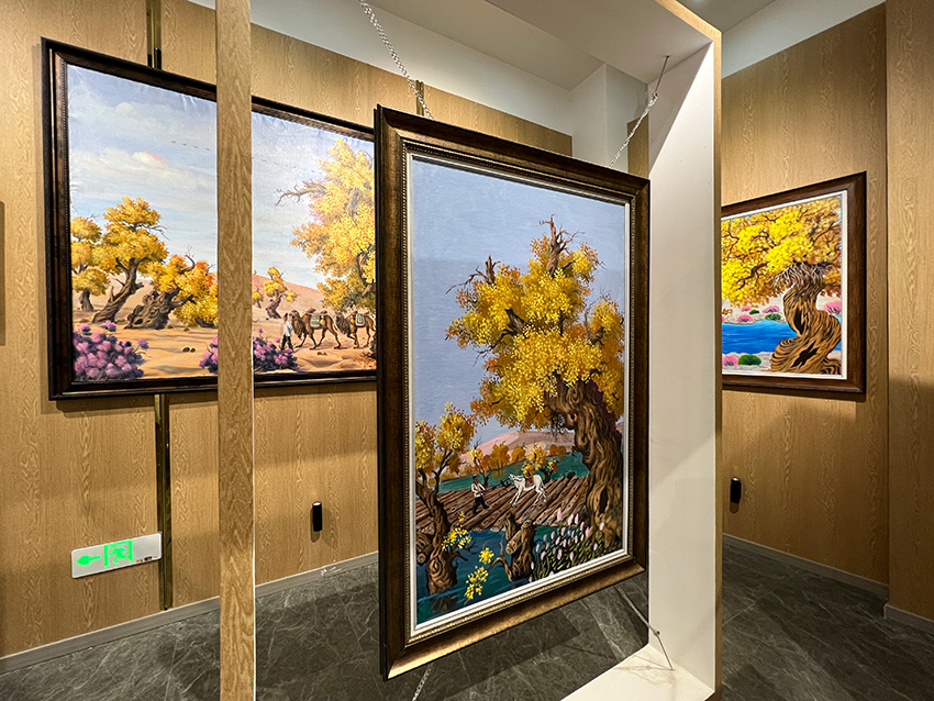 Photo shows Daolang-style paintings created by farmers in northwest China's Xinjiang Uygur Autonomous Region at an exhibition hall. (People's Daily Online/Chang Xuemei)