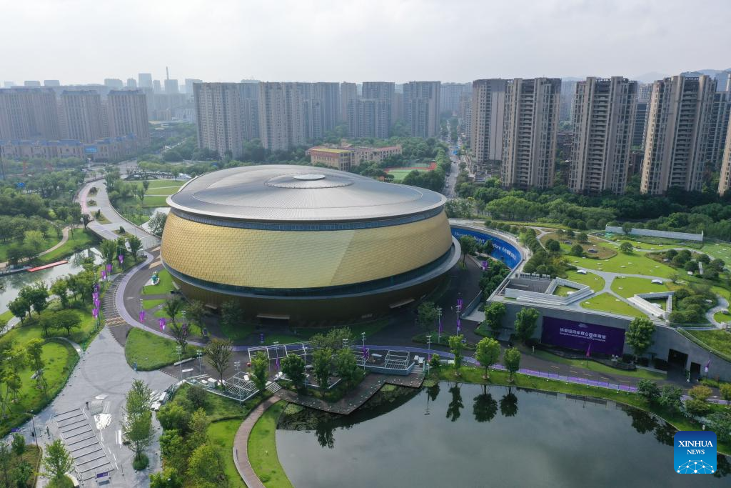 This aerial photo taken on Aug. 23, 2023 shows the Gongshu Canal Sports Park Gymnasium in Hangzhou, east China's Zhejiang Province. (Xinhua/Huang Zongzhi)